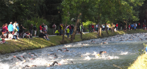 The canal entrance came fairly quickly where we had to swim up a narrow canal for about 800 metres and had been promised a fast, exciting, exhilarating, beautiful swim up the canal as the crowd cheers you on! What we actually experienced was what I can only describe as swimming up a tight tunnel with hundreds of others trying to clamber over the top of you and constant banging of limbs and bodies! Damn it was good to get to the end of the swim without losing your wetsuit being pulled off you!
